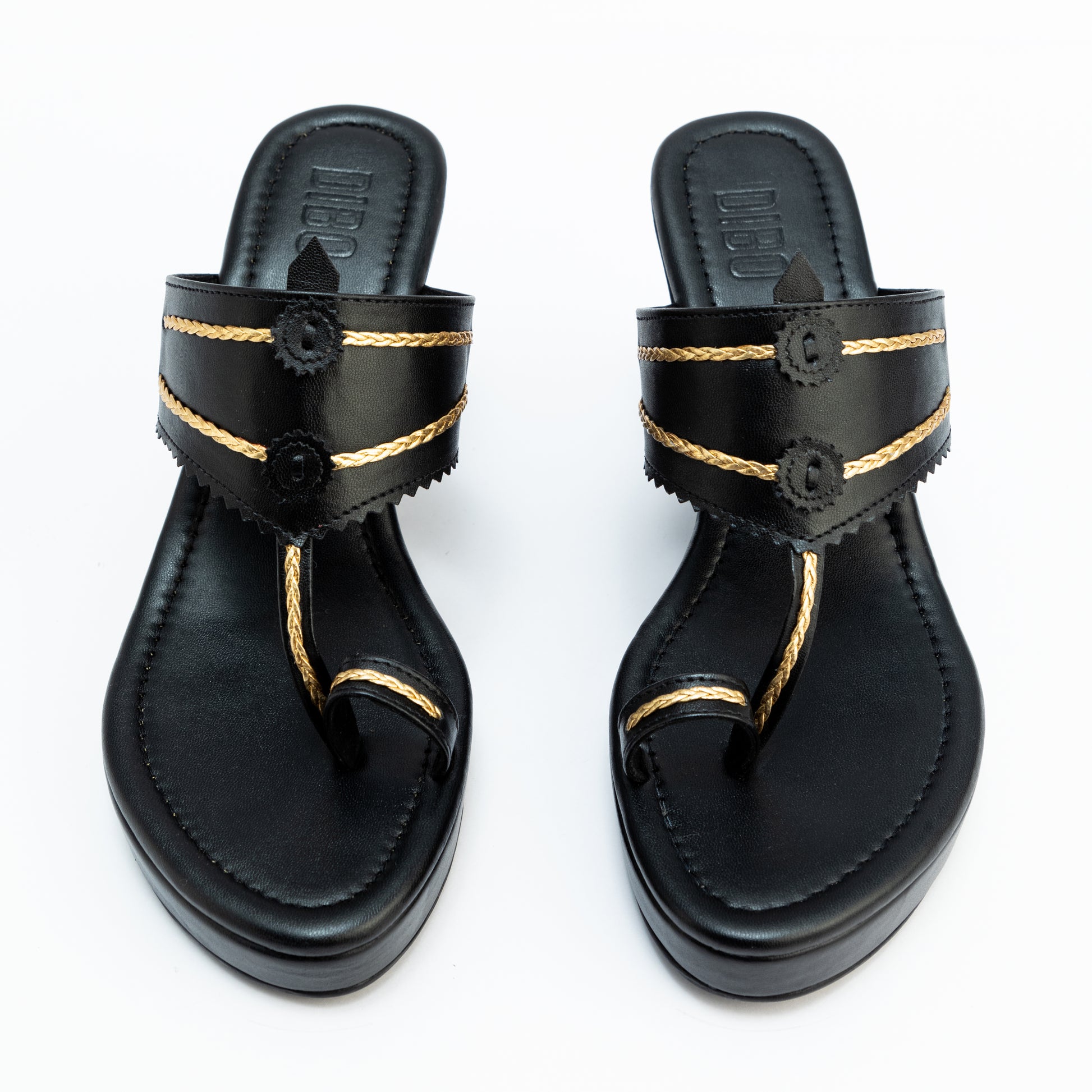 Elevate your ethnic and contemporary wardrobe with these Midnight Black Kolhapuri Wedges from DIBO. Blending traditional Kolhapuri craftsmanship with a modern wedge heel, these sandals bring elegance, comfort, and versatility together in one stunning pair.
