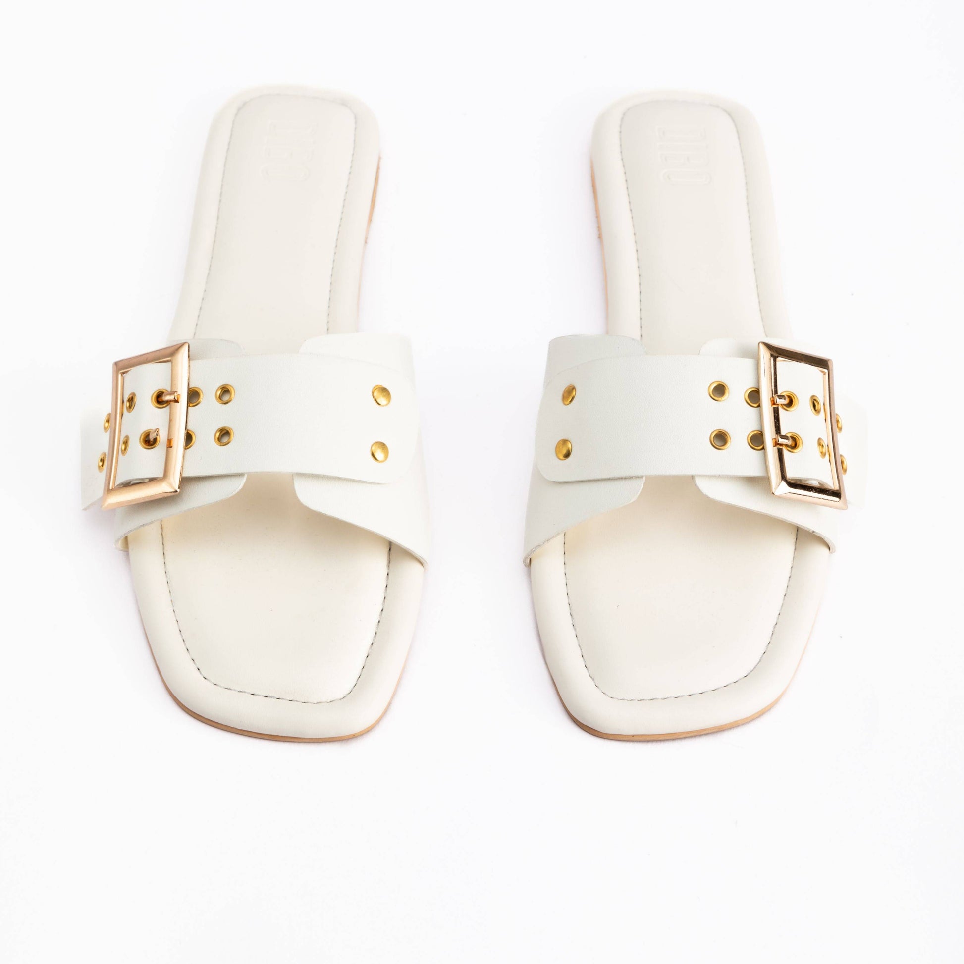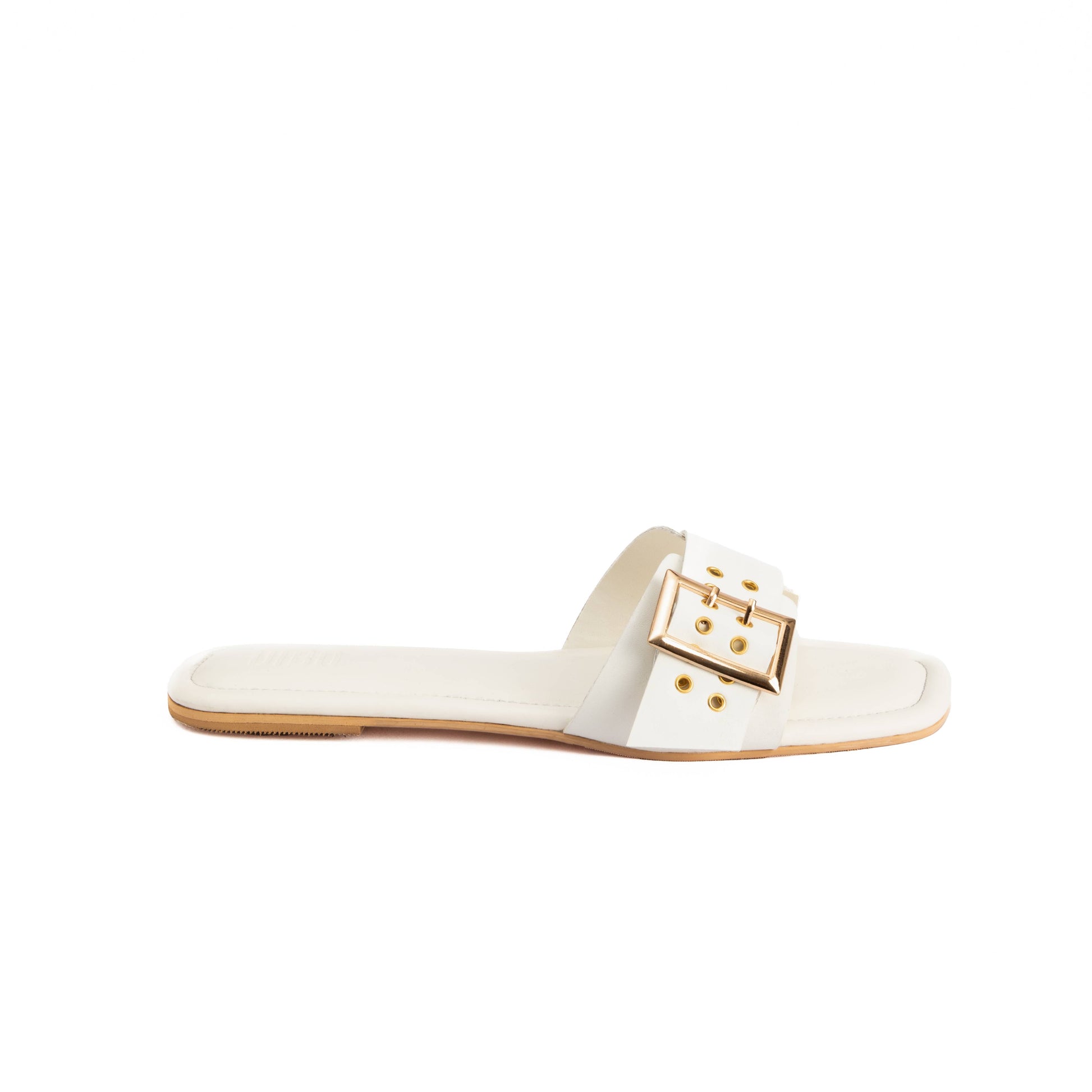 The sleek white finish is versatile enough to pair with any outfit, while the oversized gold buckle adds a touch of luxe. Whether you're heading to brunch or stepping out for an evening stroll, these flats promise style without compromising on comfort.