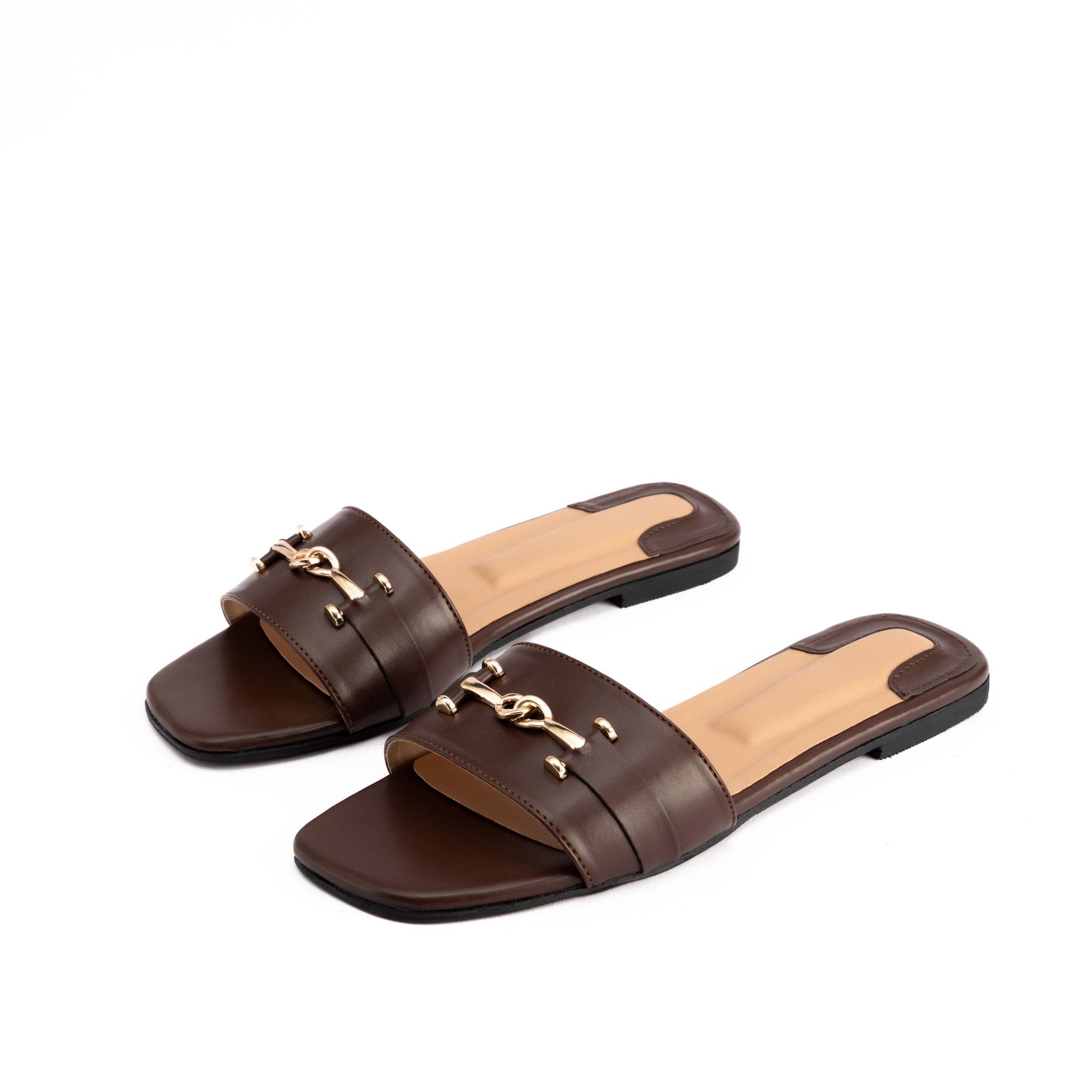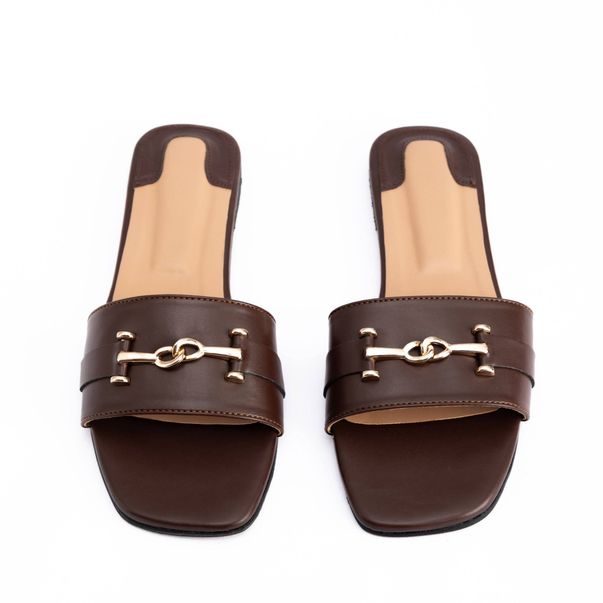 The rich coffee brown tone pairs beautifully with the gleaming gold hardware, making it a versatile choice for office wear, casual brunches, or evening strolls. The slip-on style and cushioned insole ensure all-day comfort without compromising on style.
